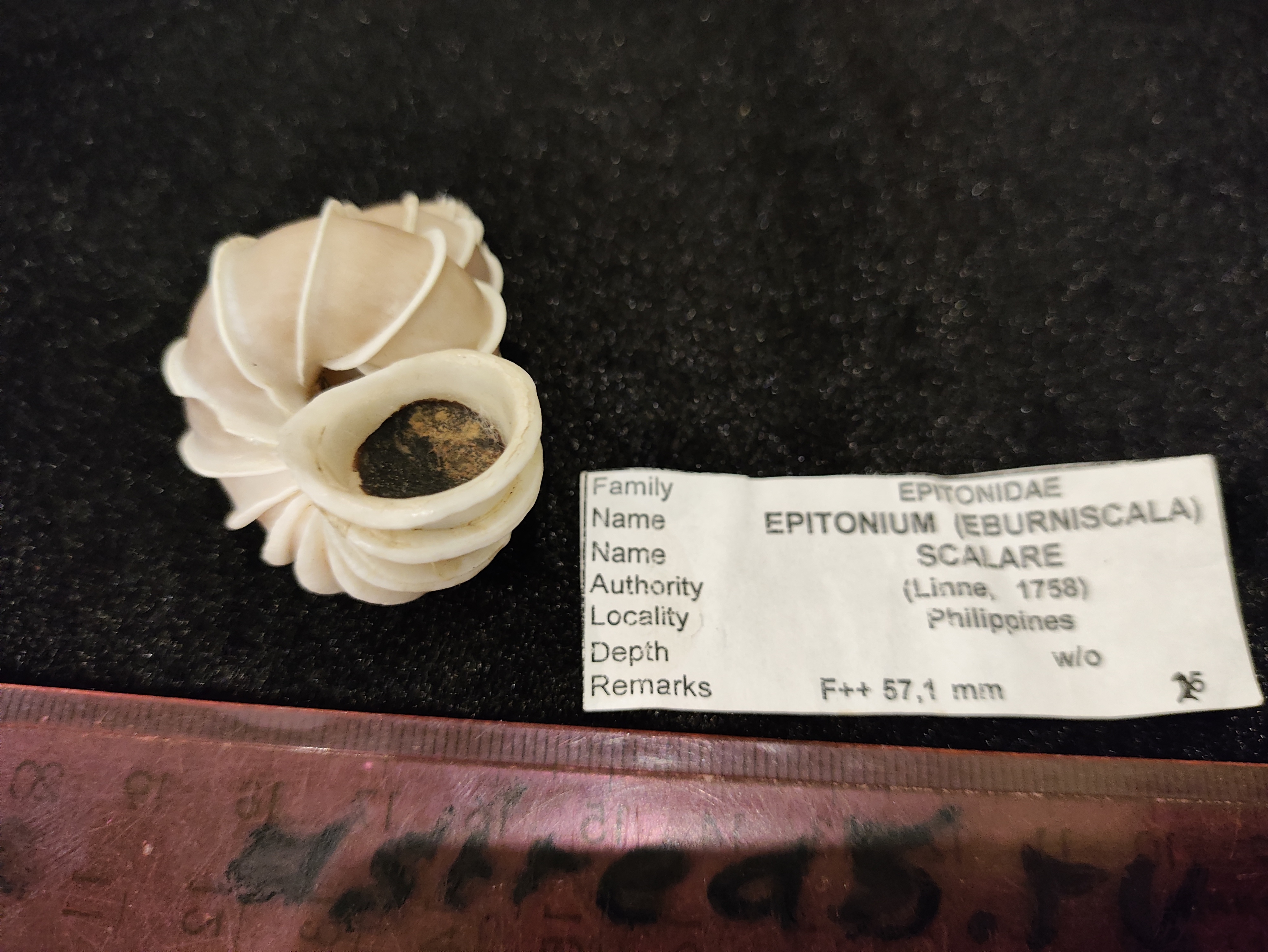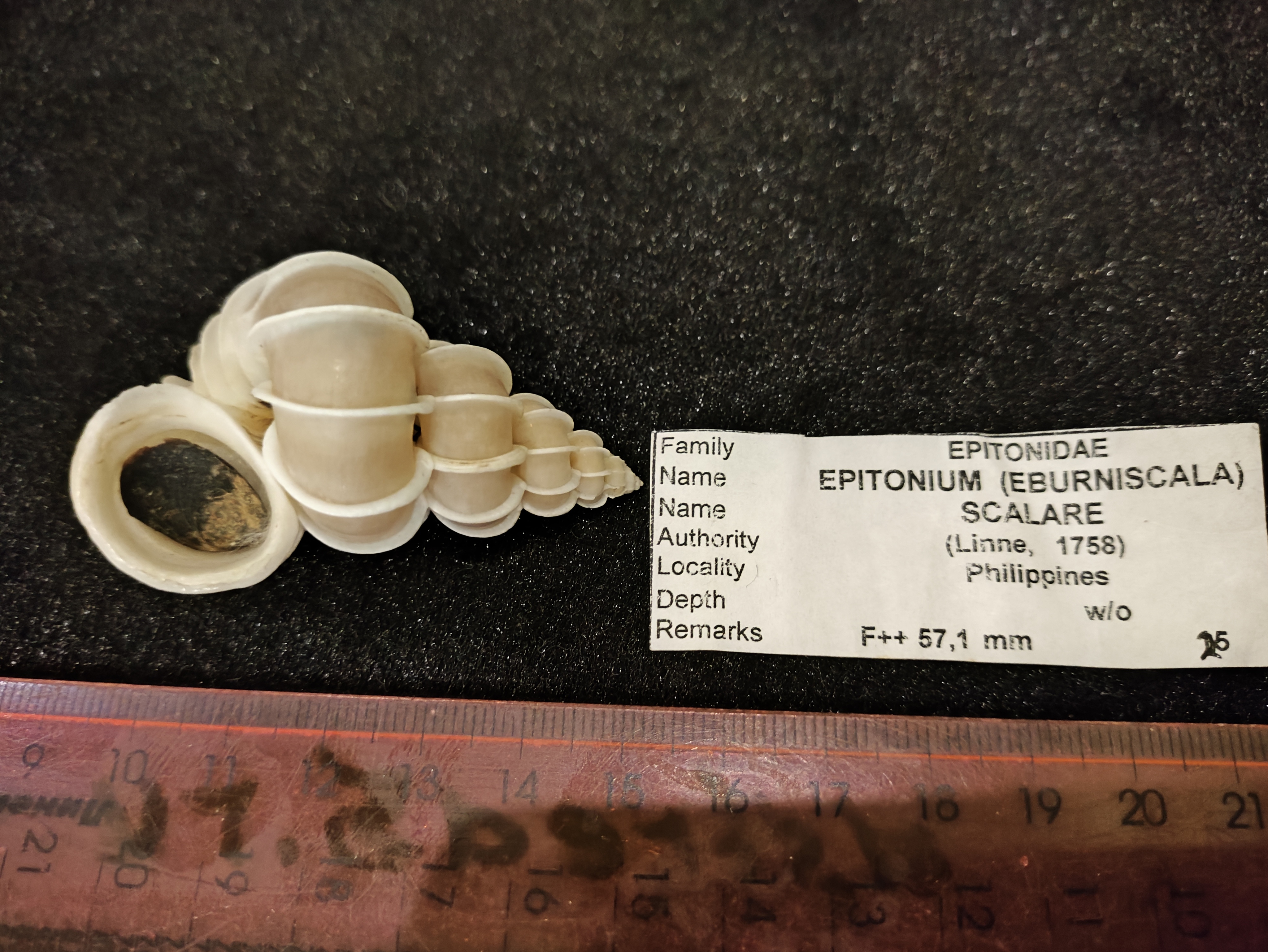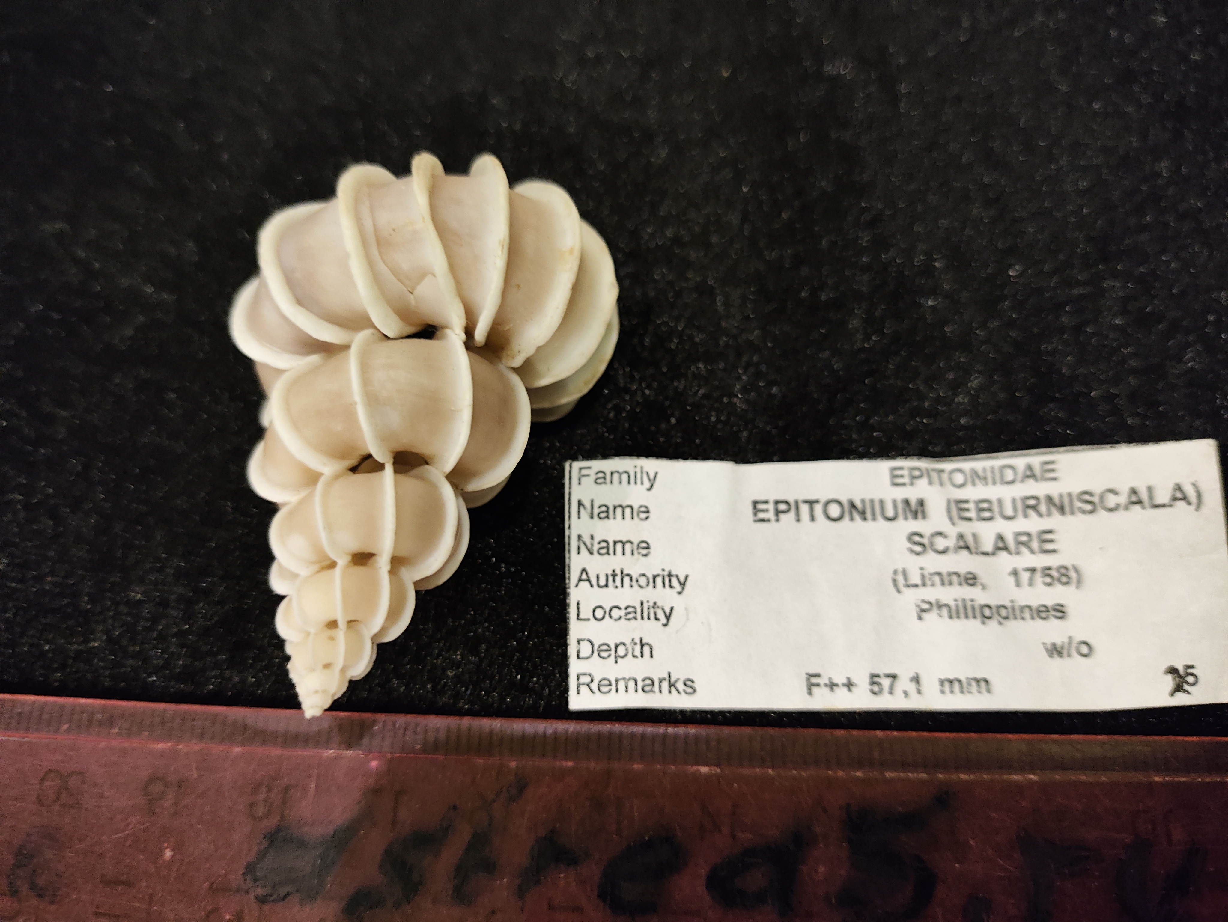 Тонкостенная ,фактурная раковина ,спиралевидной формы. Эпитониум Скаляр, Лестничный,Epitonium Scalare, семейство Epitonidae.Общий окрас светло бежевый,ребра спиралей белые. Выростает до 70мм .Под заказ.