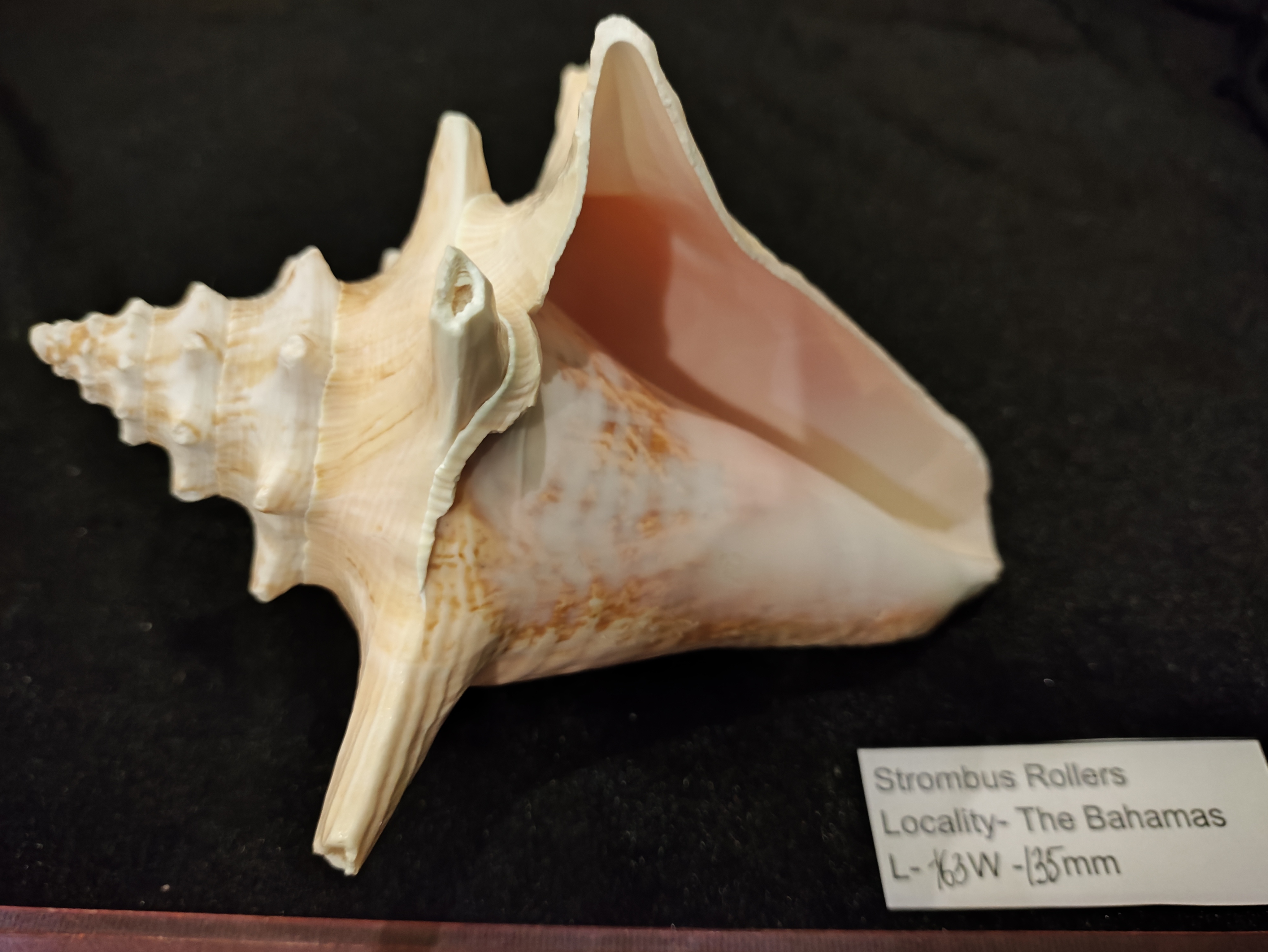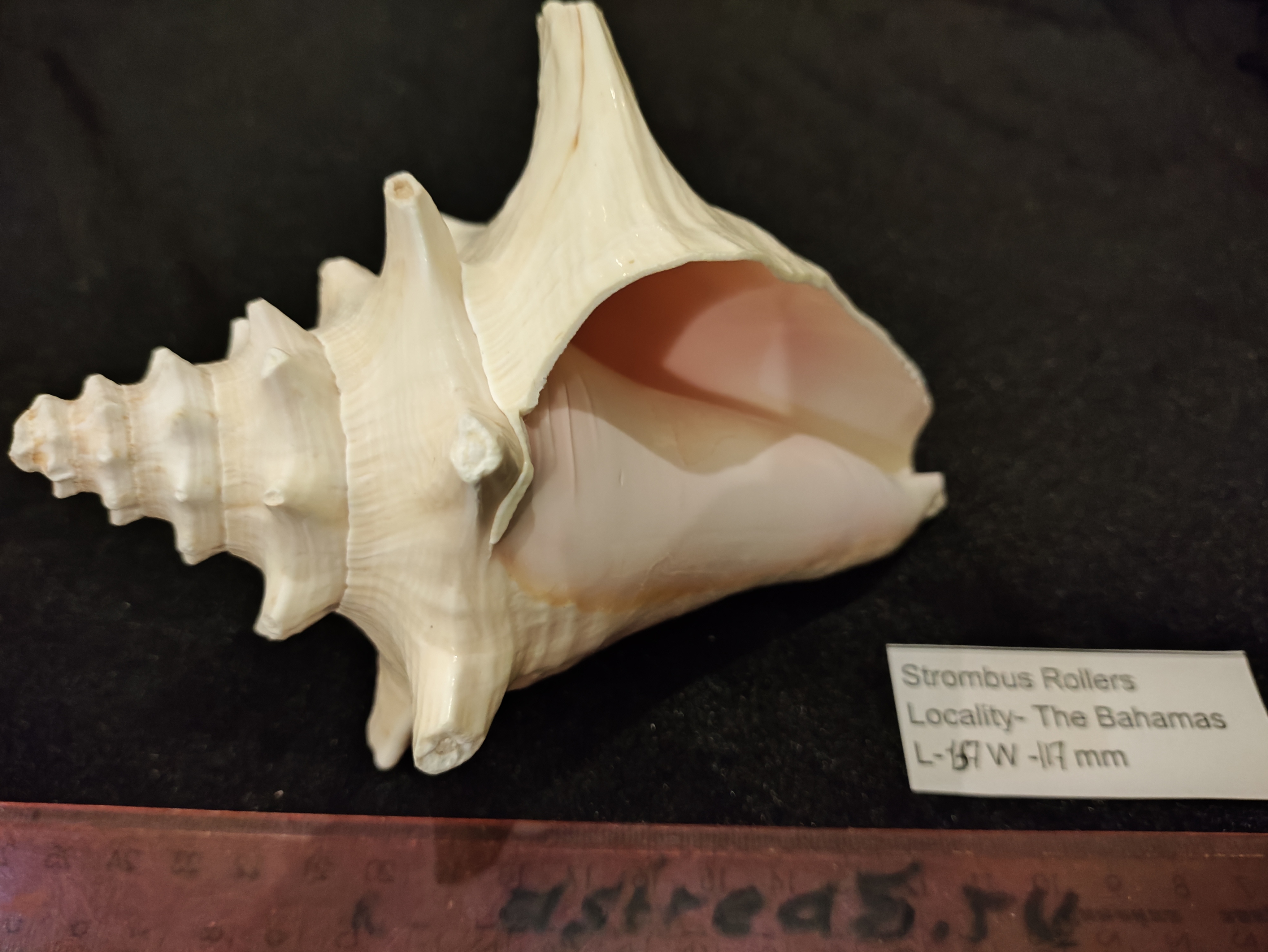 Strombidae.Молодая особь Стромбус Гигас. Раковина толстостенная,массивная с длинными рожками ,устье перламутровое от нежно розового до темного окрас, сама раковина светло желтого или светло розового цвета.Название получил за строение и поведение моллюска в море.Большие Стромбус в разделе Аналогичные.